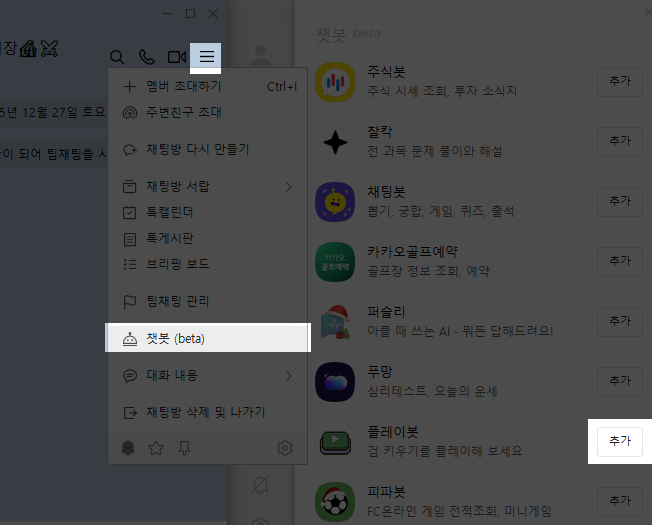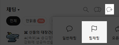 채팅방 상단에 목록을 누르고, 팀채팅 관리를 엽니다.