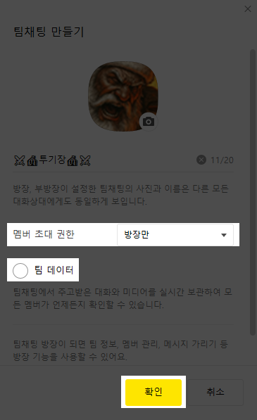 이제 옵션으로 멤버 초대 권한을 방장만으로 하고, 팀 데이터 옵션을 꺼주고 확인을 눌러 줍니다.
