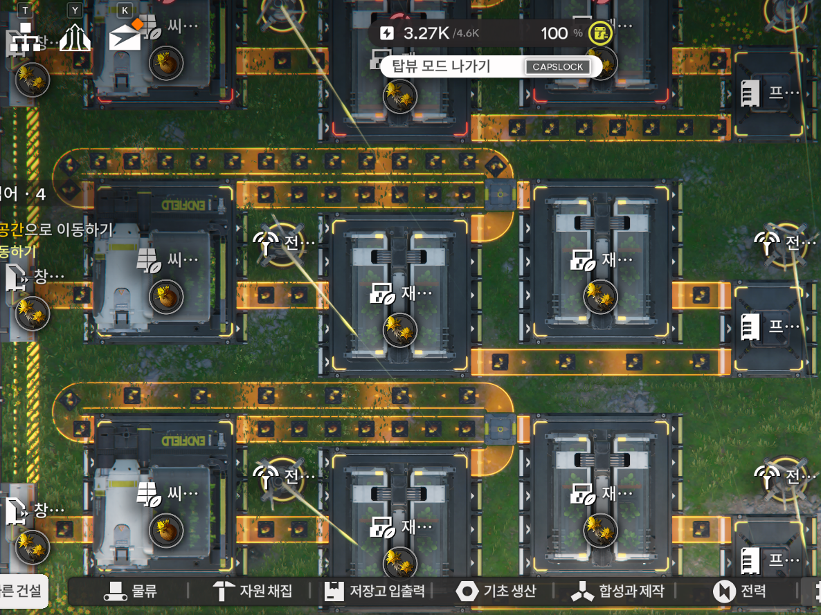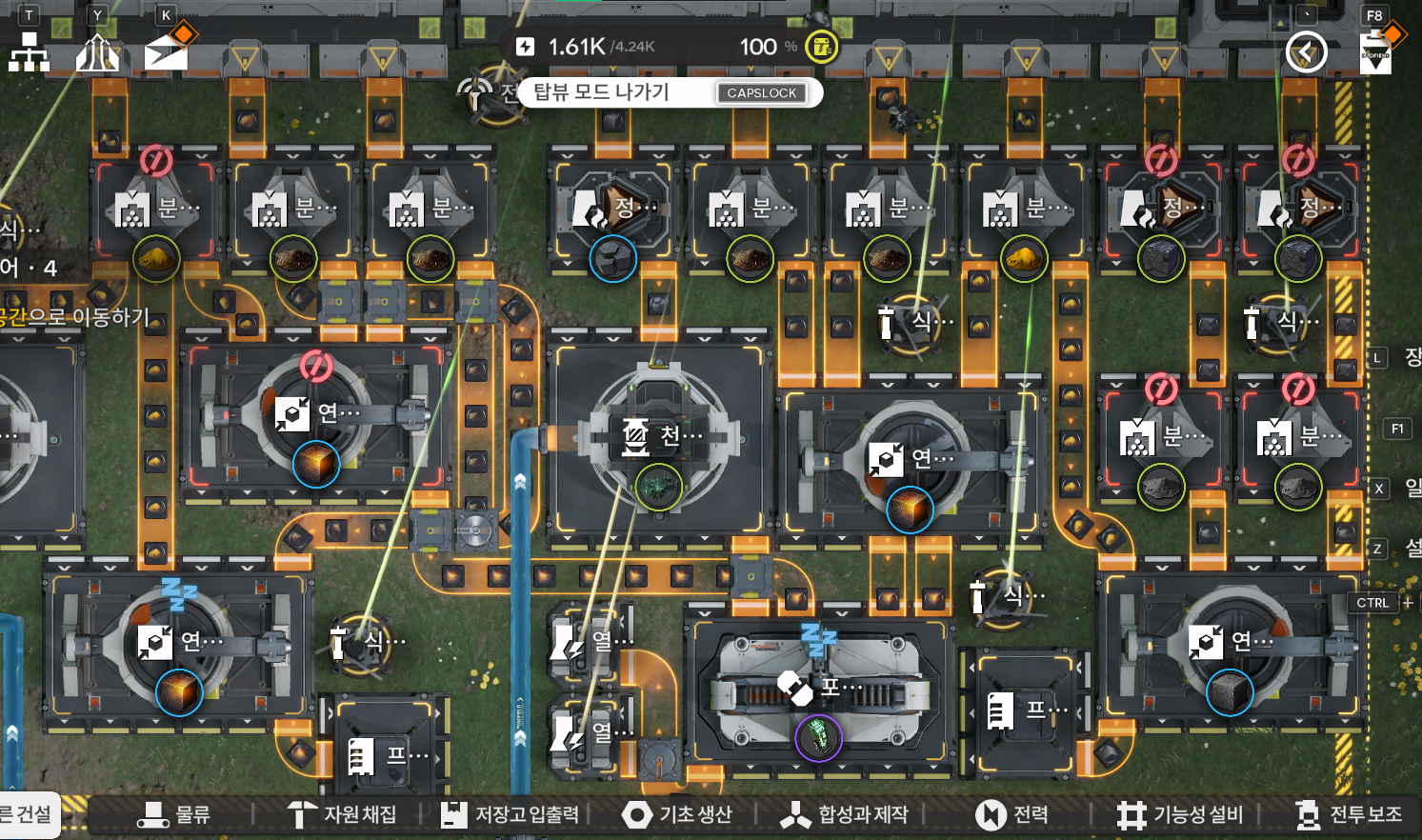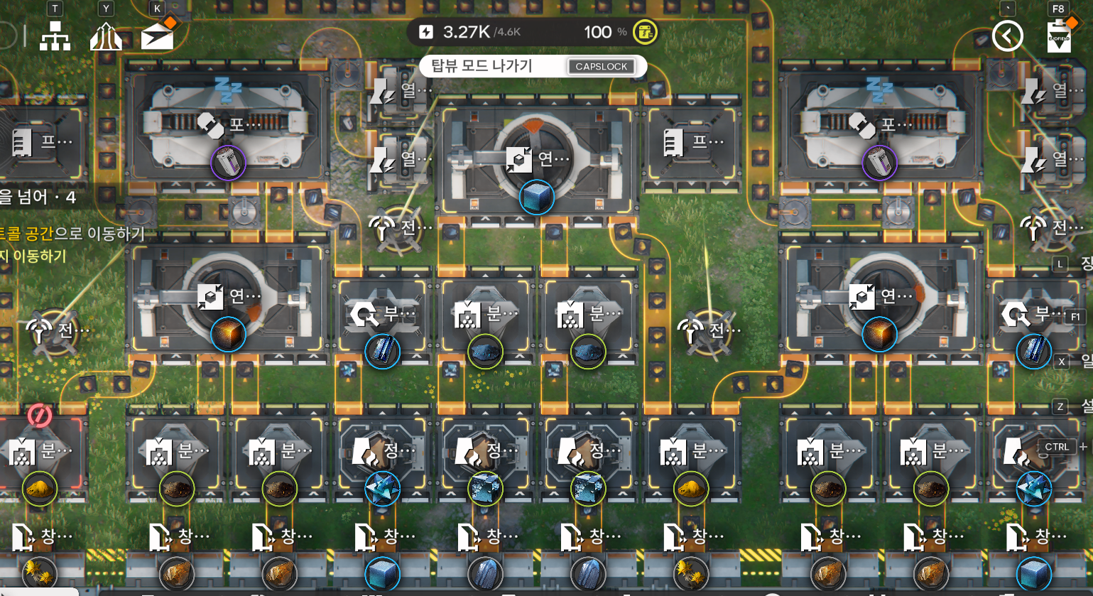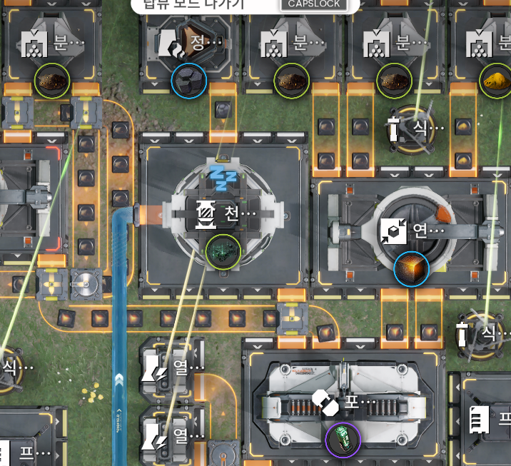 사진의 제 잉여 거점 센터 상황만 봐도 공간이 협소하여, 대형 배터리 2대를 서로 붙여놓고, 바로 위에다가 거점 센터를 오리지늄 공장으로 돌리고 있습니다.