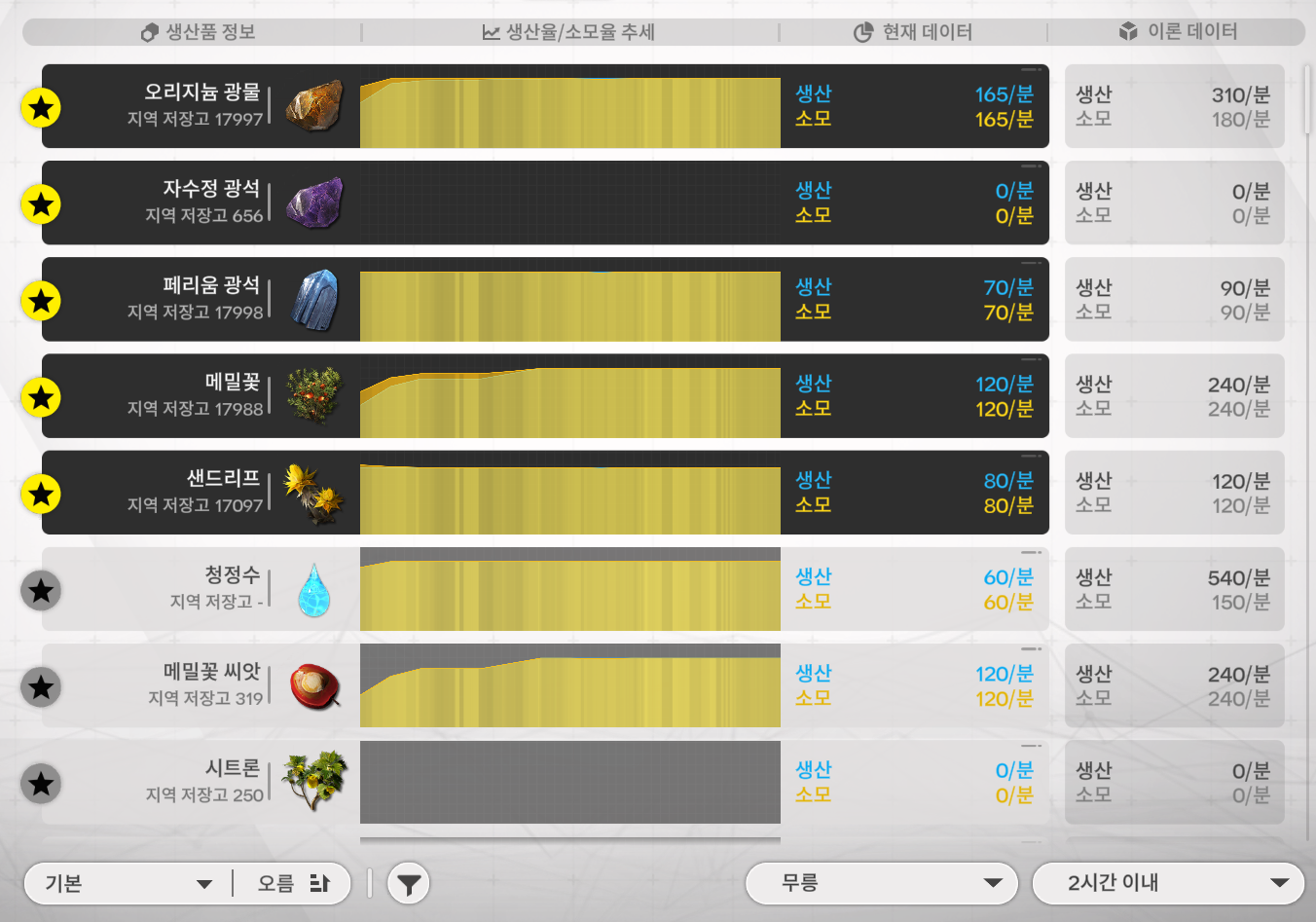 오른쪽 아래 2시간 이내 체크후, 위에 그래프에 재료들이 "현재 데이터"에 소모량이 같거나 이하가 아닌 "완전 1 이상 초과"라면 농장이나 맵에 배치가 아에 안된 채굴기 찾아서 더 지어줘야 합니다.