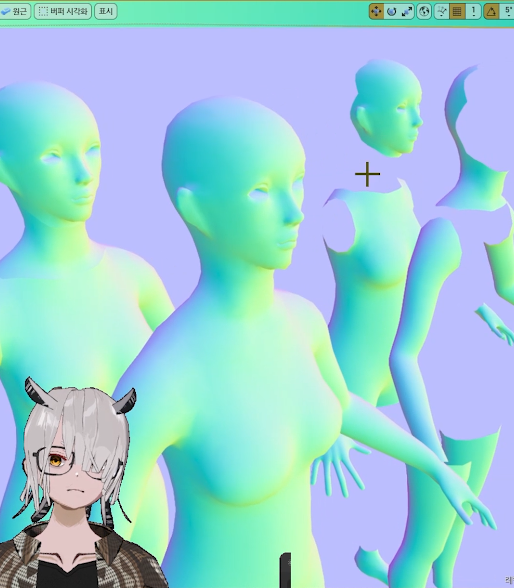 게임 엔진내에서 시각화 테스트로 노말맵들을 보면 "법선 수정자"를 안한 캐릭터가 확실히 파츠별로 선이 잘린게 보이실 겁니다.